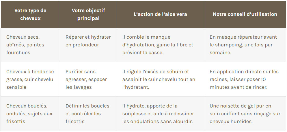 Votre type de cheveuxVotre objectif principalL’action de l’aloe veraNotre conseil d’utilisation