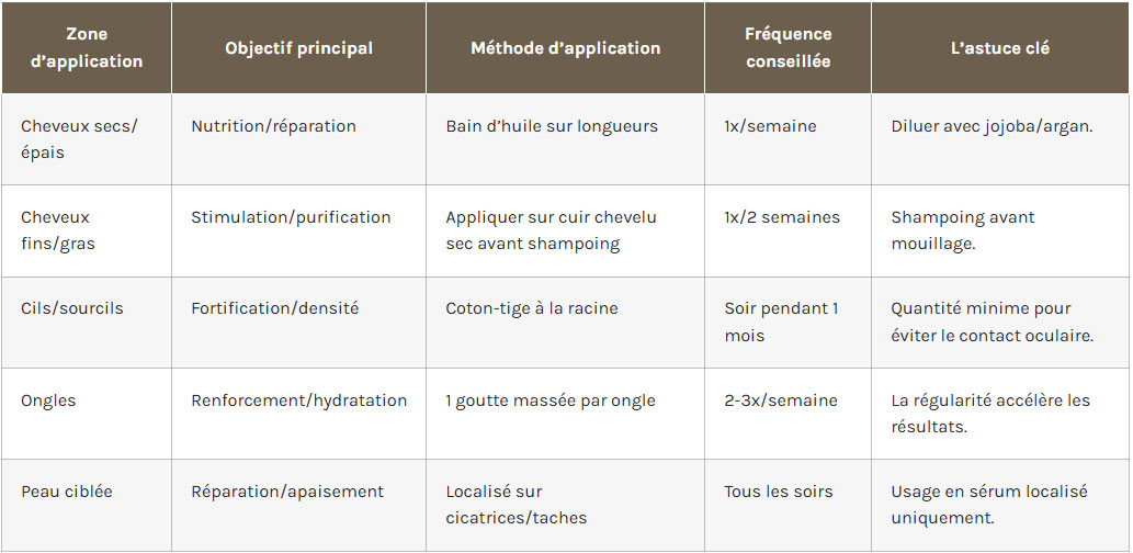 | Ongles | Renforcement/hydratation | 1 goutte massée par ongle | 2-3x/semaine | La régularité accélère les résultats. |
