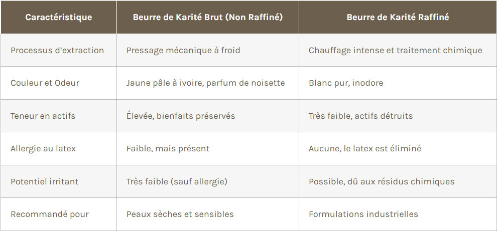 Le beurre raffiné subit un processus éliminant presque tout le latex. C’est une alternative pour les peaux réactives, mais ce raffinage supprime aussi une grande partie des insaponifiables, réduisant ses vertus réparatrices. Le beurre brut préserve ses actifs, mais comporte ce risque allergène.