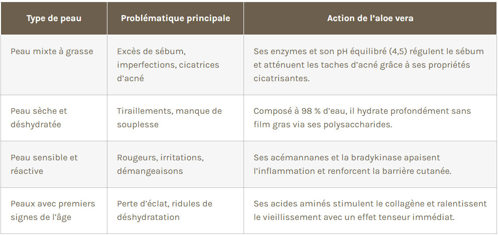 | Type de peau | Problématique principale | Action de l’aloe vera |