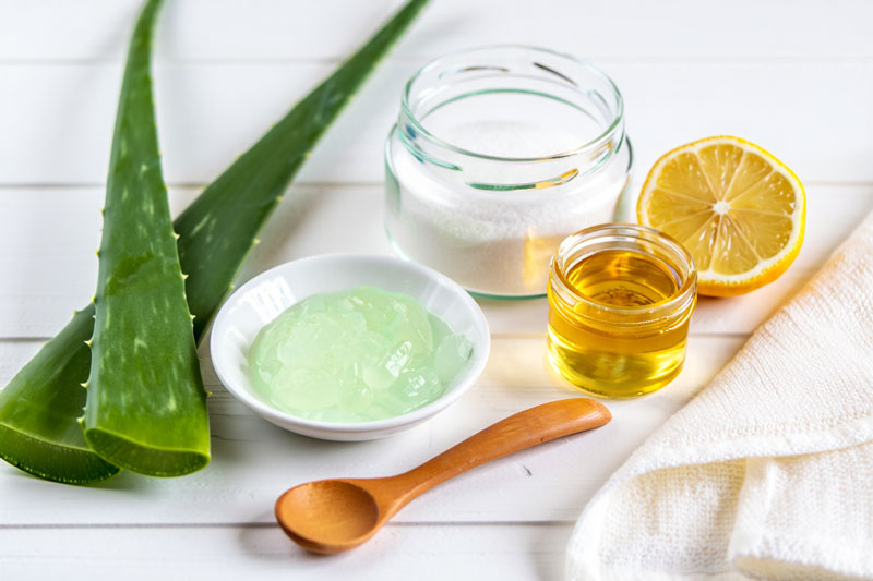 Mélangez 1 cuillère à soupe de gel d’aloe vera et 1 cuillère à café de sucre. Appliquez sur peau humide, rincez et hydratez.
