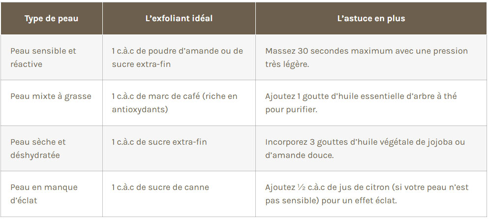 | Type de peau | L’exfoliant idéal | L’astuce en plus |