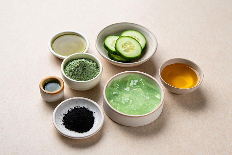 Mélangez 2 cuillères à soupe d’argile verte en poudre, 1 cuillère à café d’huile de jojoba et 2 gouttes de citron. Ajoutez de l’eau tiède pour une pâte lisse. Appliquez en couche épaisse, rincez après 10-15 minutes.