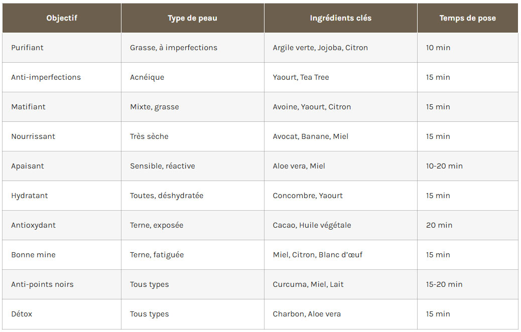 | Objectif | Type de peau | Ingrédients clés | Temps de pose |