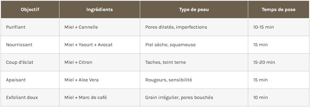 La cannelle apaise les rougeurs. Le miel régule la flore cutanée. Testez sur une zone avant usage : la cannelle peut irriter.