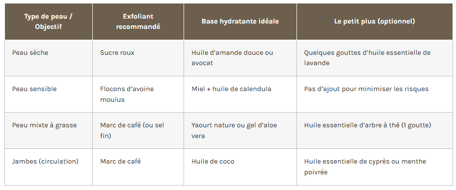 Si vous cherchez un effet plus tonique, notamment pour les zones rugueuses, le sel marin est efficace grâce à ses minéraux, mais il peut être asséchant. Pour une peau sensible comme la vôtre, privilégiez toujours la douceur du sucre ou de l’avoine.