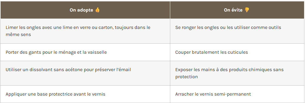 | Limer les ongles avec une lime en verre ou carton, toujours dans le même sens | Se ronger les ongles ou les utiliser comme outils |