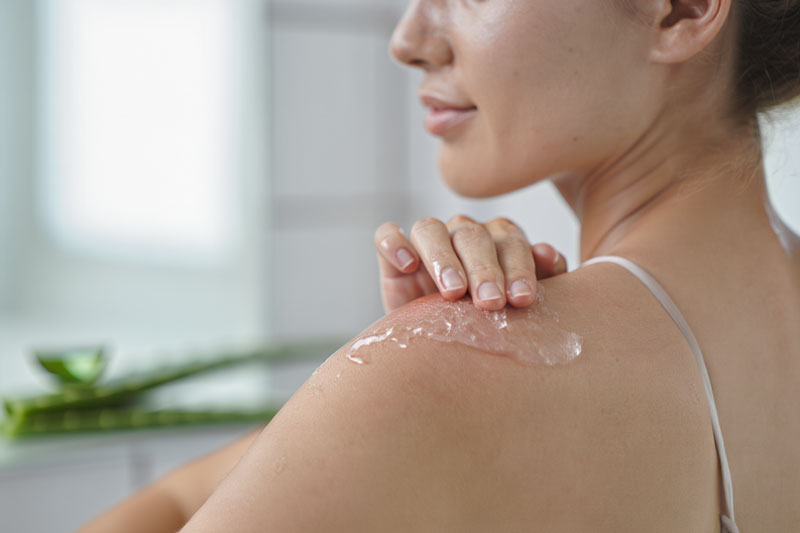 L’aloe vera possède des propriétés anti-inflammatoires, hydrate la peau et favorise la croissance et la réparation de la peau grâce à la glycoprotéine et aux polysaccharides qu’elle contient. Ces propriétés aident à apaiser la douleur, minimiser l’inflammation et réduire les démangeaisons et les éruptions cutanées.